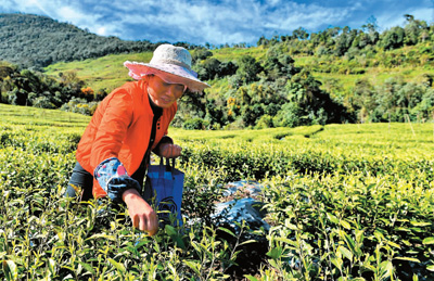 图为西藏墨脱县背崩乡背崩村村民在茶园采茶。